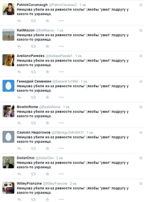 @anonim Немцова убили из-за ревности хохлы" (якобы "увел" подругу у какого-то украинца, гулял с ней, а бывший хахаль из-за ревности и расстрелял - хохлушка уже дает показания)